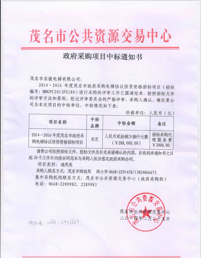 | 祝賀茂名市東駿電梯有限公司中標(biāo)茂名市財政局電梯設(shè)備采購招標(biāo)項目 |